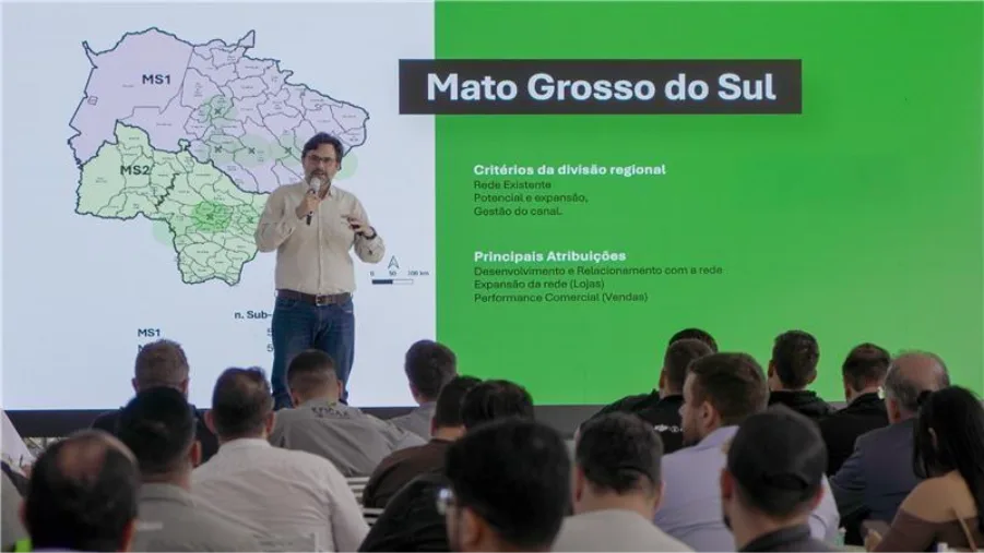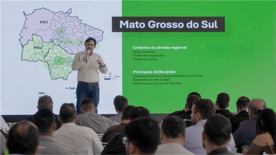 Rafael Fernandes, Diretor de Vendas Agro da Xmobots, em apresentação com os representantes de revendas