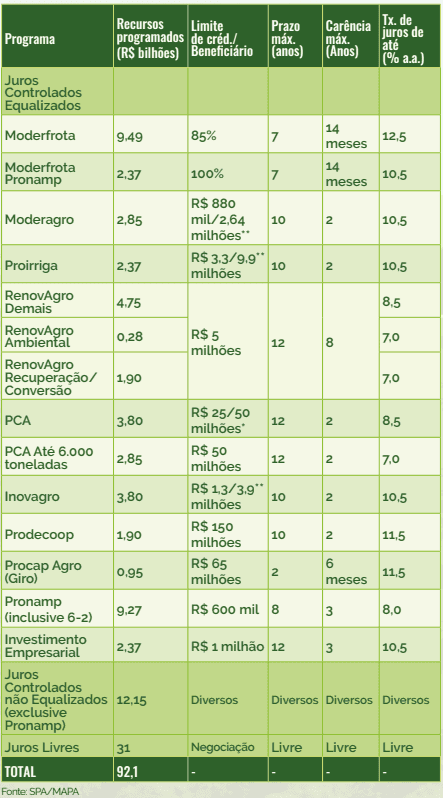 To qualify for Pronamp, the annual gross income limit must be R$3 million, an increase of R$600,000 compared to the previous harvest. This change is justified by the increase in the price of agricultural products.