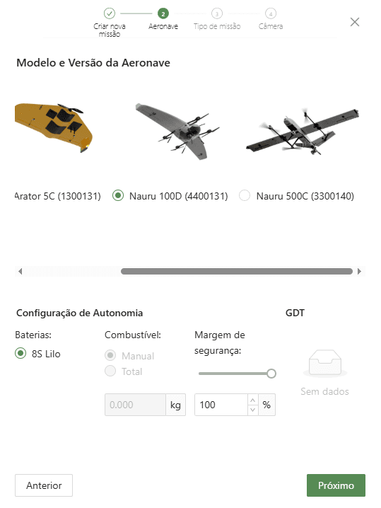 Cada dron de Xmobots tiene sus propias especificaciones de autonomía, alcance y carga útil. Por eso, al planificar el vuelo, XCockpit solicita al piloto que indique qué aeronave y versión está utilizando en la operación, para que la misión se optimice de acuerdo con las características del dron.