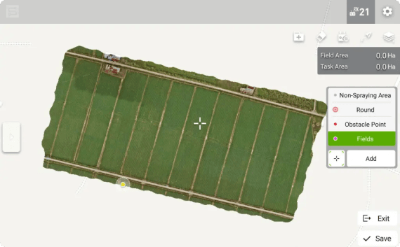 Faça um levantamento aéreo de todo o campo, identifique automaticamente limites de campo e obstáculos, e planeje rotas de voo mais precisas.