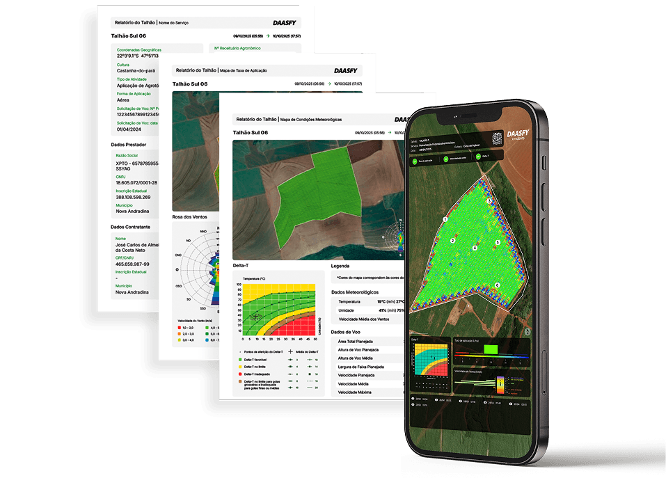 Na DAASFY, você gerencia frotas e times de pulverização com drone no celular.