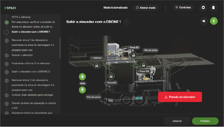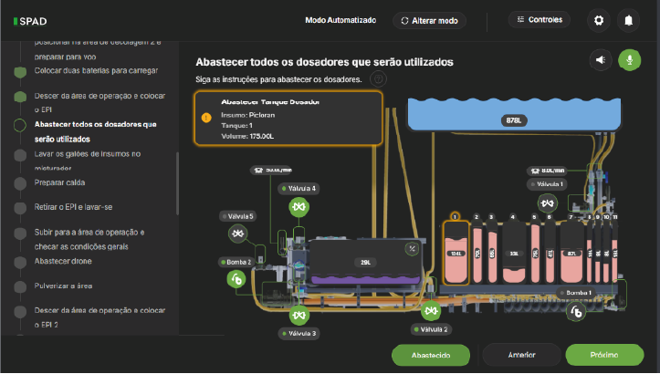 Por meio de tutoriais ilustrados comandados por voz e com o apoio da assistente virtual (Inteligência Artificial), que auxilia a operação desde o abastecimento do gerador, até a tríplice lavagem dos tanques de insumos e calda.