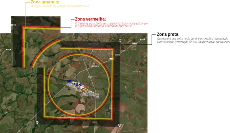 Quando o drone entra nesta zona, é acionada a recuperação automática de terminação de voo via abertura de paraquedas.