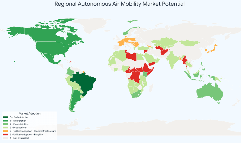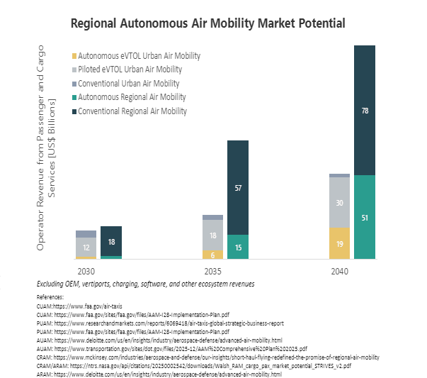 As primeiras aplicações economicamente relevantes da mobilidade aérea autônoma regional distribuída deve ocorrer em 2030 para transporte de carga e 2034 para transporte de pessoas, devendo atingir um mercado de US$ 15 Bilhões em 2035, crescendo rapidamente para US$ 51 Bilhões em 2040.