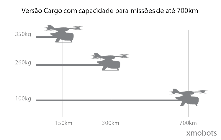 Além de 2 passageiros, o programa “Xmobots Vision” é projetado com foco em atender o requisito de alcance de centenas de quilômetros (distância percorrida) inerente à mobilidade regional.